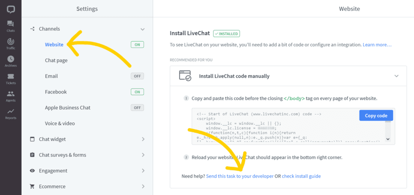 Instalacja LiveChat jest oparta na kodzie JavaScript. Jeżeli chcesz zainstalować czat ręcznie, skopiuj gotowy kod znajdujący się w ustawieniach (Settings > Channels > Website) i wklej do plików swojej witryny HTML tuż przed tagiem .